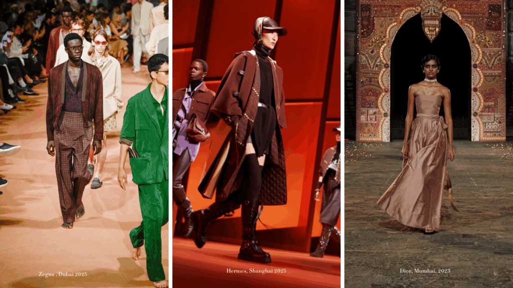 Recent front rows in Mumbai (Dior), Hangzhou and Hong Kong (Chanel), Shanghai (Hermès), and Dubai (Zegna) illustrate this dual strategy—convening billionaires and cultural elites while inspiring the next generation of clients.